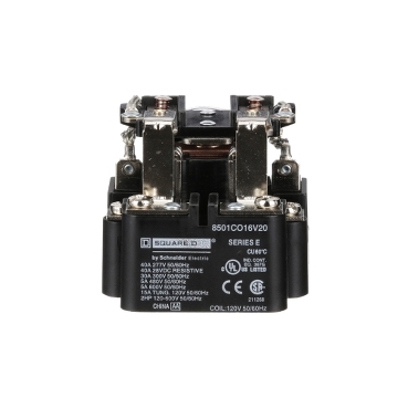 8501C power relays are used to control small single phase motors and other light loads. These power relays are available with a variety of contact configurations. This relay has a DPDT contact configuration with two normally open and two normally closed contact. A variety of coil voltages are available. This relay has a 120 VAC nonreplaceable coil. Designed with heavy duty contacts that are rated for single phase 1.5 HP motors at 120 VAC, 230 VAC or 600 VAC. It also has a 30 A resistive rating at 300 VAC or 5 A resistive rating at 600 VAC. These relays have a durable open frame construction. 8501C power relays are UL listed and CSA certified. This range of relays is used in electric heater, pumping, conveyor and material handling applications. Specifications Main product range Power Relay 8501C product type Power relay short name type C [In] rated line current 30 A device application Suited for controlling small single phase motors and other light loads switch function DPDT contact composition 2 NO/2 NC [Uc] control circuit voltage 120 V AC 50/60 Hz horsepower rating 2.0 hp maximum switching voltage 600 V AC Complementary class number 8501 phase 1 phase terminal connects Screw clamp terminal wire range AWG 10 copper terminal tightening torque 11…15 lbf.in (1.24…1.69 N.m) coil burden 10 VA mounting Panel mounting Environment ambient temperature range - operational -22…122 °F (-30…50 °C) product certifications UL listed file E78351 CCN NLDX CSA CE height 3.12 in (79.25 mm) width 2.5 in (63.50 mm) depth 2.31 in (58.67 mm)
