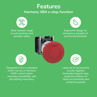 Cette tête de bouton rouge champignon d'arrêt/arrêt d'urgence Harmony XB4 de 30 mm fonctionne avec un mécanisme push-pull verrouillé. Cette tête de bouton d'arrêt/arrêt d'urgence également appelée EMS (Emergency Machine Stop) et EMO (Emergency Off) offre une interface ergonomique pour contrôler vos machines. Il s’installe facilement sur des boutons poussoirs d’arrêt d’urgence et d’arrêt complets compatibles. Il se distingue clairement visuellement à distance grâce à une couleur claire et une forme de champignon proéminente de 30 mm. Il est résistant aux chocs, à la poussière, à l'eau et aux vibrations grâce à son IP66. Il possède une lunette métallique, ce qui le rend idéal pour les applications nécessitant une résistance élevée aux chocs et aux vibrations. Il est conçu pour s'adapter à une découpe standard de 22 mm, garantissant ainsi la compatibilité lors de l'installation dans des machines préexistantes. Sa large plage de températures de fonctionnement de -40°C à 70°C permet une polyvalence dans l'utilisation du produit. Caractéristiques Principal Gamme de produits Harmony XB4 Type de produit ou de composant Tête pour bouton-poussoir d'arrêt d'urgence Nom abrégé de l'appareil ZB4 Matériau de la lunette Métal chromé Diamètre de montage 0,9 po (22 mm) Vente par quantité indivisible 1 Forme de la tête de l'unité de signalisation Ronde Type d'opérateur action de déclenchement et verrouillage mécanique Réinitialiser Push-pull Profil opérateur Champignon rouge Ø 30 mm, non marqué Type de tête Standard Complémentaire Largeur hors tout CAD 1,2 po (30 mm) Hauteur hors tout CAD 1,2 po (30 mm) Profondeur totale CAD 2,2 po (56 mm) Poids net 0,172 lb (États-Unis) (0,078 kg) Résistance au nettoyeur haute pression 1015,3 psi (7000000 Pa) 131,0000000000 °F (55 °C) 0,1 m Durabilité mécanique 300 000 cycles Code de composition électrique C7 4 simple montage frontal C8 4 montage frontal simple et double C11 3 simple montage frontal C15 1 simple montage frontal C10 4 montage frontal simple et double présentation de l'appareil Élément de base